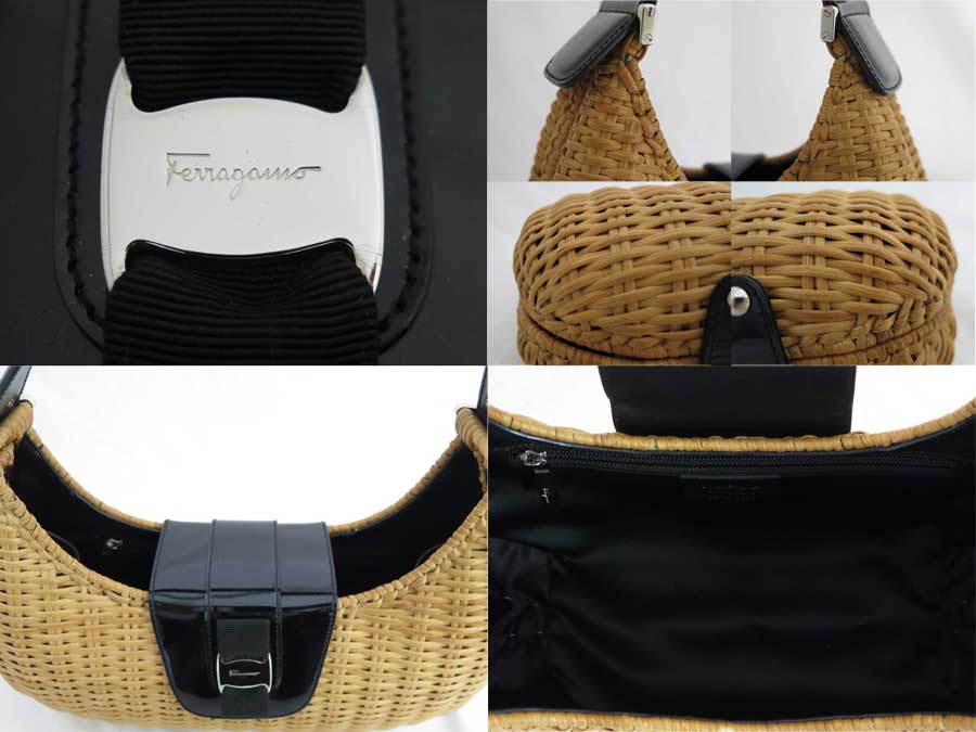 サルヴァトーレフェラガモ Salvatore Ferragamo バッグ ヴァラリボン ナチュラルブラウンxブラックxシルバー金具 ストローxパテントレザー ショルダーバッグ カゴバッグ レディース 【中古】【おすすめ】 - e40700