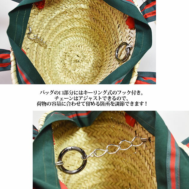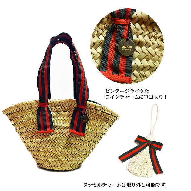 ≪Maison Connie≫ メイソンコニー天然素材 パームツリー ストライプ リボン タッセル チャーム カゴバッグ (Red/Green)【レディース】