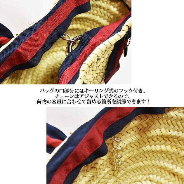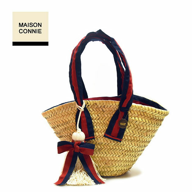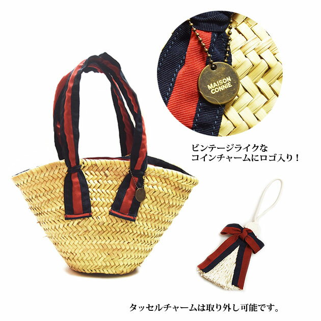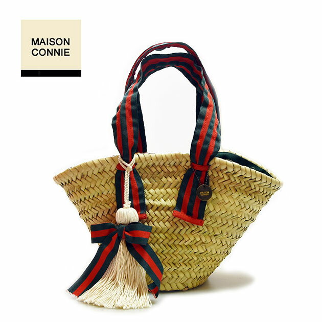 ≪Maison Connie≫ メイソンコニー天然素材 パームツリー ストライプ リボン タッセル チャーム カゴバッグ (Red/Navy)【レディース】